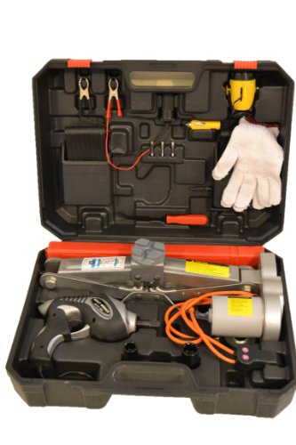 - All-In-One Portable Powered Flat Tire Changing Kit ** Safety Equipment that fits in an easy-to-carry case ** Powered by 12v DC Outlet ** Electric Scissor Jack to Raise and Lower vehicle with 1 button ** Electric Impact Wrench to remove most lug nuts with ease
