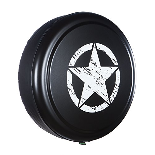Boomerang® Distressed Star Rigid tire cover featuring a distressed WWII style "Oscar Mike" star design provides the finishing touch to your Jeep Wrangler including the Freedom Edition. The tread is covered by a durable automotive-grade soft vinyl band that is stitched to the heavy duty, molded black texture ABS face plate. Jeep owners love the easy installation, superior protection and upscale look Boomerang®Rigid tire covers add to the rear profile of their vehicle. Available in many sizes including all 2007-2015 factory Jeep Wrangler (JK) spare tire sizes. (An optional lock kit is available but should be ordered with the tire cover.) PLEASE CONTACT US IF YOU ARE UNSURE OF YOUR CORRECT SPARE TIRE SIZE. We can help you verify the correct size tire cover for a perfect fit.